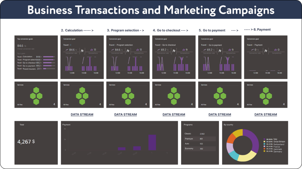 Where business indicators are available, they can be captured and displayed on dashboards for analysis by analysts and product managers.